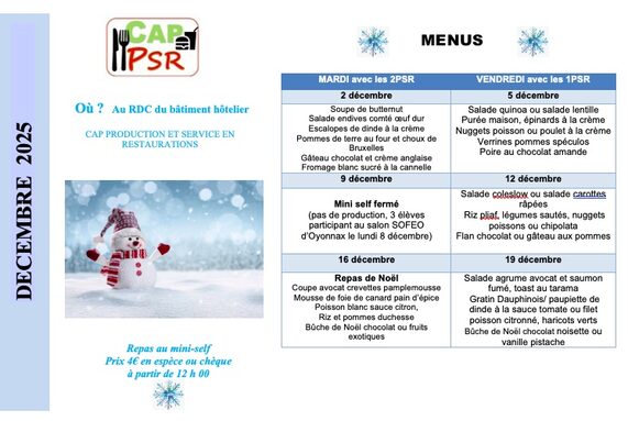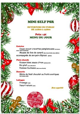 Par SANDRINE SOARES, publié le lundi 15 décembre 2025 18:26 - Mis à jour le lundi 15 décembre 2025 18:26REPAS DE Noël Ouverture du mini-self à partir de 12 H Prix du repas : 4 euros -